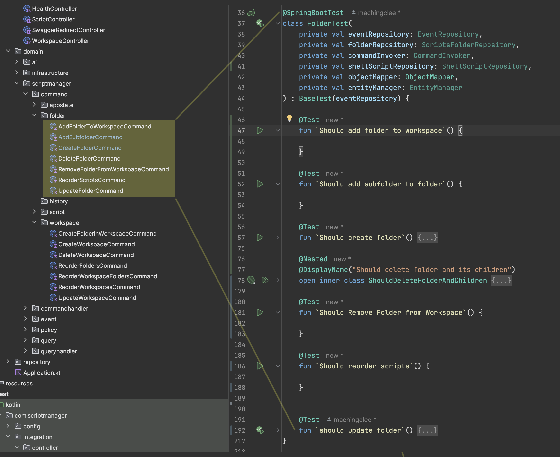 @SpringBootTest class FolderTest( private val eventRepository: EventRepository, private val folderRepository: ScriptsFolderRepository, private val commandInvoker: CommandInvoker, private val objectMapper: ObjectMapper, private val entityManager: EntityManager ) : BaseTest(eventRepository) { @Nested @DisplayName("Should delete folder and its children") open inner class ShouldDeleteFolderAndChildren { private lateinit var parentFolder: ScriptsFolder private lateinit var subfolder: ScriptsFolder private lateinit var scriptInSubfolder: ShellScriptResponse private lateinit var scriptInfolder: ShellScriptResponse @BeforeEach @Transactional open fun arrange() { parentFolder = commandInvoker.invoke( CreateFolderCommand("Parent_${System.currentTimeMillis()}") ) subfolder = commandInvoker.invoke( AddSubfolderCommand( parentFolderId = parentFolder.id!!, name = "Subfolder_${System.currentTimeMillis()}" ) ) this@FolderTest.entityManager.flush() scriptInfolder = commandInvoker.invoke( CreateScriptCommand( folderId = subfolder.id!!, name = "Script_${System.currentTimeMillis()}_in_folder", content = "echo 'Hello, World!'" ) ) scriptInSubfolder = commandInvoker.invoke( CreateScriptCommand( folderId = parentFolder.id!!, name = "Script_${System.currentTimeMillis()}_in_subfolder", content = "echo 'Hello, World!'" ) ) } @Test @Transactional open fun `should delete folder, subfolders and all scripts inside`() { // Act commandInvoker.invoke(DeleteFolderCommand(parentFolder.id!!)) this@FolderTest.entityManager.flush() // Assert - All entities deleted assertNull( folderRepository.findByIdOrNull(parentFolder.id!!), "Parent folder should be deleted" ) assertNull( folderRepository.findByIdOrNull(subfolder.id!!), "Subfolder should be deleted" ) assertNull( shellScriptRepository.findByIdOrNull(scriptInfolder.id!!), "Script should be deleted" ) assertNull( shellScriptRepository.findByIdOrNull(scriptInSubfolder.id!!), "Script should be deleted" ) // Assert - Events emitted val events = eventRepository.findAll() val folderCreatedEvents = events.filter { it.eventType == "FolderCreatedEvent" } val subfolderCreatedEvents = events.filter { it.eventType == "SubfolderAddedEvent" } val scriptCreatedEvents = events.filter { it.eventType == "ScriptCreatedEvent" } val folderDeletedEvents = events.filter { it.eventType == "FolderDeletedEvent" } val scriptDeletedEvents = events.filter { it.eventType == "ScriptDeletedEvent" } assertEquals(1, folderCreatedEvents.size, "Should have 1 FolderCreatedEvents from setup") assertEquals(1, subfolderCreatedEvents.size, "Should have 1 SubfolderAddedEvent from setup") assertEquals(2, scriptCreatedEvents.size, "Should have 2 ScriptCreatedEvent from setup") assertEquals(2, folderDeletedEvents.size, "Should emit 2 FolderDeletedEvents") assertEquals(2, scriptDeletedEvents.size, "Should emit 2 ScriptDeletedEvent") } @Test @Transactional open fun `should emit events with correct folder IDs`() { // Act commandInvoker.invoke(DeleteFolderCommand(parentFolder.id!!)) this@FolderTest.entityManager.flush() // Assert val folderDeleteEvents = eventRepository.findAll() .filter { it.eventType == "FolderDeletedEvent" } .map { objectMapper.readValue<FolderDeletedEvent>(it.payload) } assertTrue( folderDeleteEvents.any { it.folderId == parentFolder.id!! }, "Should emit event for parent folder" ) assertTrue( folderDeleteEvents.any { it.folderId == subfolder.id!! }, "Should emit event for subfolder" ) } } }
