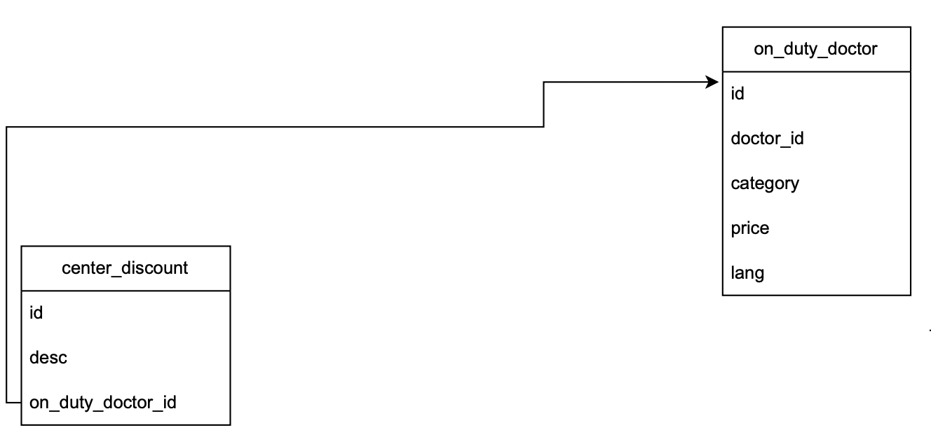 1class OnDutyDoctor(Base): 2 __tablename__ = 'on_duty_doctor' 3 4 id = Column(Integer, primary_key=True, server_default=text("nextval('on_duty_doctor_id_seq'::regclass)")) 5 6 center_discount = relationship( 7 "CenterDiscount", 8 back_populates="on_duty_doctor", 9 primaryjoin="OnDutyDoctor.id == CenterDiscount.on_duty_doctor_id", 10 uselist=False 11 ) 12 13class CenterDiscount(Base): 14 __tablename__ = 'center_discount' 15 16 id = Column(Integer, primary_key=True, server_default=text("nextval('center_discount_id_seq'::regclass)")) 17 on_duty_doctor_id = Column(Integer, ForeignKey('on_duty_doctor.id'), nullable=False) 18 19 on_duty_doctor = relationship("OnDutyDoctor", back_populates="center_discount")