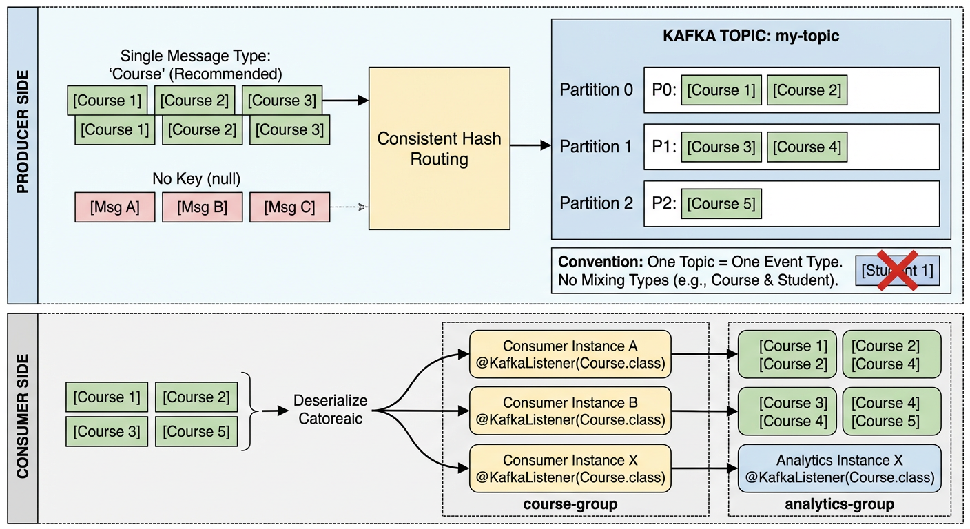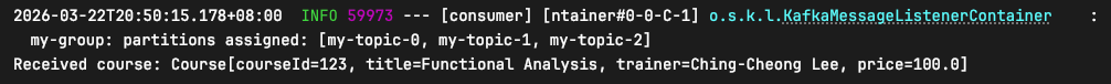 Spring Boot automatically wires a VirtualThreadTaskExecutor into the Kafka listener container factory. Each consumer thread becomes a virtual thread — extremely lightweight compared to OS threads, so the cost of having many of them is negligible.