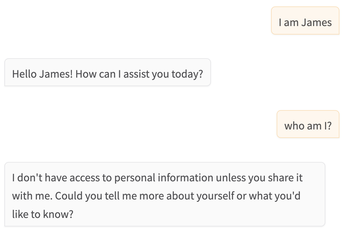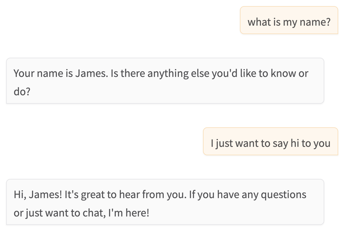 result = graph.invoke({"messages": [ {"role": "user", "content": "Hi, I am James"} ]}) print(result['messages'][-1].content)