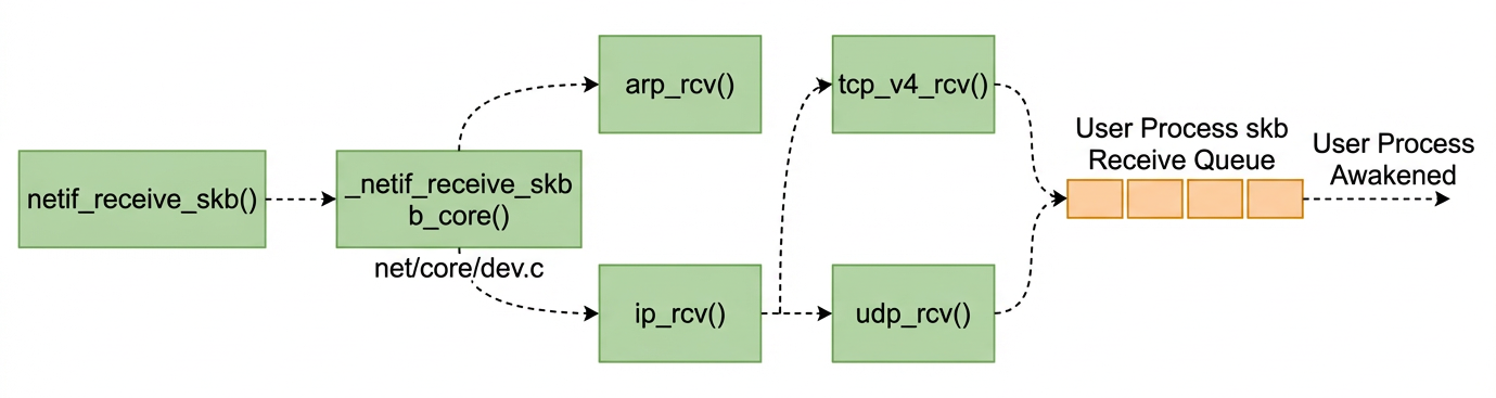 | Second | ptype_base[hash] | IP (ETH_P_IP), ARP (ETH_P_ARP), IPv6 (ETH_P_IPV6), … | Delivers to exactly the handler matching the frame's EtherType |