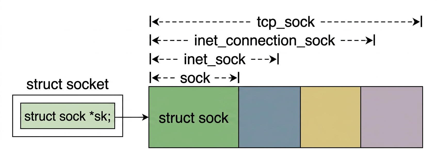 sock— the base socket object.inet_sock— extendssockwith IP-level addressing fields.inet_connection_sock— extendsinet_sockwith connection management fields, including the accept queue.tcp_sock— extendsinet_connection_sockwith TCP-specific state and timers.