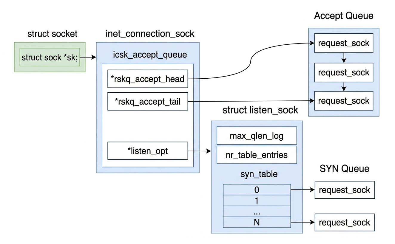 The accept queue is a simple linked list because FIFO access is all we need — a head pointer and a tail pointer are sufficient. The SYN queue, on the other hand, is managed through listen_opt, a pointer to a listen_sock: