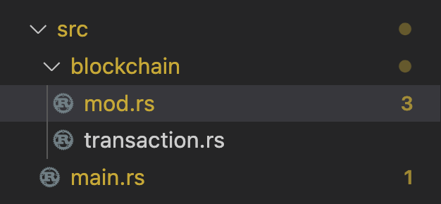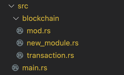 // blockchain/mod.rs pub mod transaction // accessible by main.rs // mod trasnaction // accessible only by blockchain/mod.rs.
