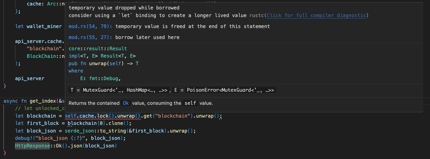 async fn get_index(&self) -> HttpResponse { let unlocked_cache = self.cache.lock().unwrap(); let blockchain = unlocked_cache.get("blockchain").unwrap(); let first_block = blockchain[0].clone(); let block_json = serde_json::to_string(&first_block).unwrap(); debug!("block_json {:?}", block_json); HttpResponse::Ok().json(block_json) }