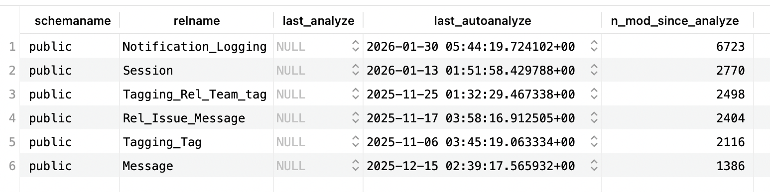 - 6,723 modifications since last analyze (most active table)